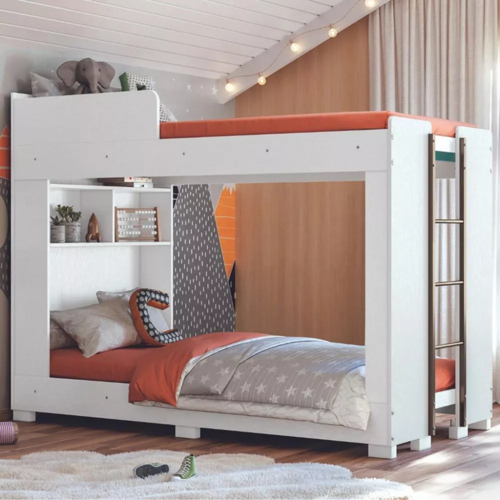 E não para por aí! Com prateleiras na cabeceira, oferecemos espaço extra para organizar objetos, livros e tudo mais que as crianças precisam ao alcance das mãos.